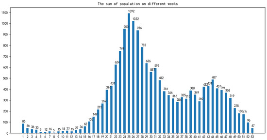 Figure 3. HFMD’s proportion of each population category. - In terms of time: As shown in Figure 4, the infection time of patients is mainly concentrated in 22–32 weeks (June-August). The 24th, 25th, and 26th week is the HFMD epidemic period, and the number of infections reaches a large peak. There are also multiple occurrences in 36–48 weeks, reaching a small peak of infection around the 44th week. Therefore, the prevalence of HFMD is characterized by a strong seasonal infection. The relevant weather indicators can be used as one of the important factors in determining the prevalence of HFMD.