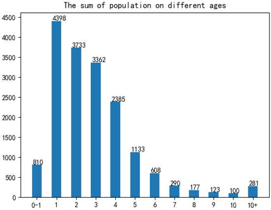 Figure 5. Age distribution of HFMD epidemic. the link (http://data.sheshiyuanyi.com/WeatherData/, accessed on 1 March 2020). x-axis is in years.