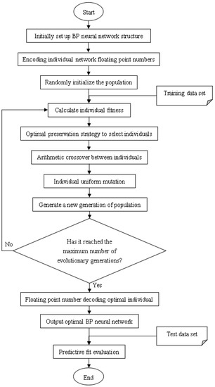 Finally, it is necessary to calculate the fitness of all individuals, select individuals for genetic operations, including replication, crossover and mutation, to generate a new generation of populations [22]. In this paper, the fitness can be calculated directly from the average error of the individual on the sample. Therefore, select high fitness, i.e., individuals with small errors for retention, and select low fitness, i.e., individuals with large errors for elimination. Thus, individual neural networks with poor fit are discarded in the training process. Then, perform uniform mutation and arithmetic crossover operations on general individuals to obtain a new generation. After repeated training reaches the specified number of evolutions, the optimal model is obtained. Otherwise, it returns to the fitness calculation step to reiterate. The final individual is decoded to obtain all the connection weights in the neural network, which are used for actual prediction and quantitative evaluation indicators are obtained. Figure 8 is a detailed flowchart of the GA-BP HFMD prediction model.