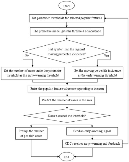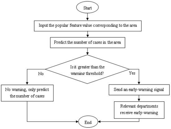 As there is no yet a complete and accurate early-warning mechanism for infectious diseases, HFMD epidemic early-warning methods based on adjustable parameters, moving percentiles and a combination of the two are proposed, mainly proposed different methods for the setting of HFMD early-warning threshold. The HFMD epidemic early-warning model is mainly based on the number of HFMD cases in the region generated by the above HFMD epidemic prediction model and the number of cases in the same period in history. That is, whether there will be an outbreak of HFMD epidemic in the early warning area, Or according to historical data in the same period, relevant health departments need to be warned to increase the vigilance of the HFMD epidemic in the region. The overall process of the model is shown in Figure 9.