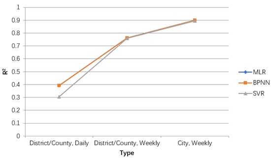 To obtain a more accurate prediction model of the number of HFMD cases, the different temporal and spatial precisions were compared. From the finest time accuracy (day) and spatial accuracy (districts and counties) to a week and prefectures, respectively, linear regression, BP neural network and SVR are used to fit predictions. Because the average and variance of the number of cases in different time and space accuracy are very different, only the goodness of fit is used to compare the models. The experimental results are shown in Table 2, and the broken line graph is shown in Figure 11. With the expansion of time and space accuracy, the goodness of fit of the model doubles. At the same time, in the comparison of three different methods, the BP neural network prediction model has the largest , so the city-level weekly prediction model based on the BP neural network has the highest accuracy.