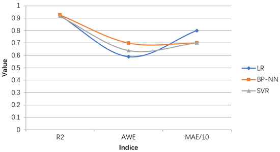 In this paper, by training and forecasting numerical variables, based on the weekly incidence of HFMD in the city and the weekly weather data that affects the epidemic and the child population data, the relevant variable analysis of the influencing factors is carried out. After that, a multivariate joint feature selection method based on correlation analysis was used to screen out a subset of features suitable for building a linear model, including the weekly ordinal number of the statistical time, the incidence of the previous week, the weekly average air pressure, and the number of children aged 0–6. At the same time, a subset of features suitable for establishing a nonlinear model is obtained, including the weekly ordinal number of the statistical time, the incidence of the previous week, the weekly average air pressure, the weekly minimum temperature, the weekly air humidity, the wind level and the number of children aged 0–6. Three regression methods were used to establish a model to fit the weekly incidence. Under different evaluation indicators, the training results of each model are shown in Table 3 and Figure 12. The analysis shows that the of the BP neural network reaches the maximum and the MAE reaches the minimum. At the same time, when the prediction error does not exceed the MAE, the AWE reaches its maximum value. Therefore, the HFMD epidemic prediction model based on BP neural network performs best, and the fitting effect is relatively best.