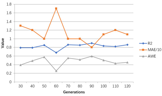 The model evaluation results of adjusting the number of generations are shown in Table 5, and the line graph shown in Figure 13 is drawn accordingly.