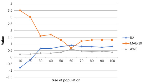 The evaluation results of the model for adjusting the population size are shown in Table 6, and the line graph shown in Figure 14 is drawn accordingly.