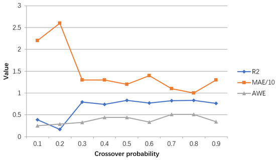 Line chart of the adjustment results of the crossover probability of the hyperparameters in the GA-BP model. The value represents results for R2, MAE/10, AWE for different parameters settings.