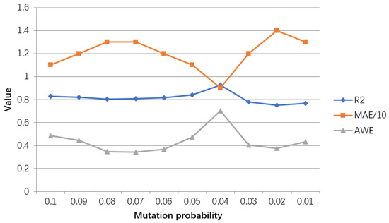 It can be obtained from Table 8 and Figure 16 that when the mutation probability is 0.04, the goodness of fit and AWE reach a good result, the maximum value is selected, and MAE is minimum. Higher or lower than this probability will make the relevant index value worse. Therefore, the GA model with a mutation probability of 0.04 has the best performance and a better effect.