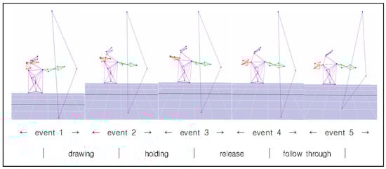 - Lee, J.H.; Hah, C.K.; Ryu, J.S.; Kim, K.C. Evaluation on motion features of the world’s second archer during back-tension in archery. Korean J. Sport Biomech. 2007, 17, 197–207. [Google Scholar]