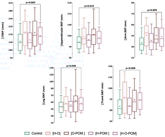 - This phenotype H-O-POM had higher 7∑ SKF (p = 0.003), ∑appendicular SKF (0.01), ∑arm SKF (0.005), ∑leg SKF, and ∑trunk SKF (p = 0.008) (Figure 2);