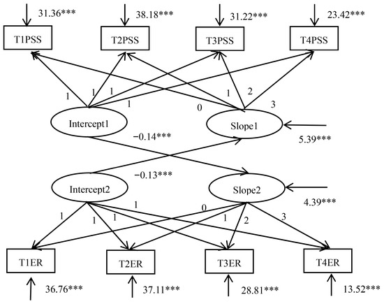 Parallel process latent growth model for ego-resiliency and perceived social support. Notes. PSS = perceived social support, ER = ego-resiliency, *** p < 0.001.