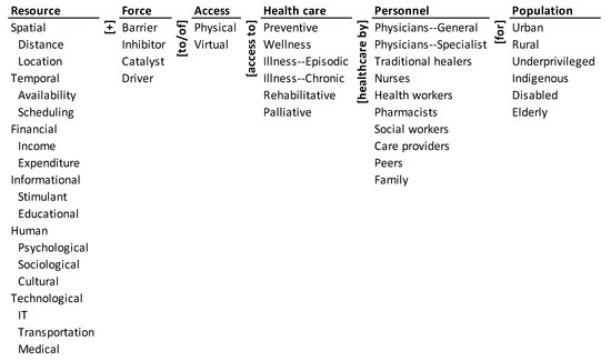 The ontology of access to healthcare during COVID-19 is shown in Figure 1. It encapsulates the various resources that affect access to healthcare such as spatial, temporal, financial, informational, human, and technological ones. These resources can be barriers, inhibitors, catalysts, or drivers to physical and virtual access to different types of healthcare. These forces could affect preventive care, wellness, episodic illness, chronic illness, rehabilitative, and palliative healthcare for different population segments such as the urban, rural, underprivileged, indigenous, disabled, and the elderly populations. Access to healthcare may be provided by varied personnel that include general physicians, specialist physicians, traditional healers, health workers, pharmacists, social workers, care providers, peers, and family.