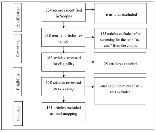 The corpus of research was created from searching Scopus on TITLE-ABSTRACT-KEYWORDS of the articles indexed in the database. We experimented with different search terms. The broad term (healthcare w/3 access AND COVID-19) yielded 800 documents. The narrower term (health w/2 care w/3 access AND COVID-19) yielded 704 documents. Finally, the search term (healthcare AND access AND COVID-19) was used to retrieve 334 items on 9 September 2020. The items included different document types such as review, note, letter, conference paper, editorial, and other types of documents. We retained only 318 journal articles which represent a high-quality collection of peer-reviewed research on healthcare access during COVID-19. We further filtered out the selected articles with the word “access” in them. Based on the first iteration, the author with domain expertise further filtered 25 articles that were not relevant including protocols for hospital implementation. After this, all the authors agreed and further excluded 27 articles that were not related to healthcare access during COVID-19. Thus, 131 articles were included and considered for coding. Figure 2 details the search process and results, following the PRISMA reporting guidelines [38]. We then downloaded the title, abstract, and keywords of selected articles and imported them into an Excel spreadsheet for mapping. The reference management software Zotero (Corporation for Digital Scholarship, Vienna, VA, USA) was used to store the selected corpus.