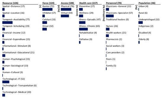 The monad map in Figure 3 numerically and visually summarizes the frequency of occurrence of each dimension and element of the ontology. The number adjacent to the dimension name and the element is the rate of occurrence in the 131 papers of access to healthcare during COVID-19 that were reviewed and mapped. The bar below each element is proportional to the frequency relative to the maximum frequency among all elements. Since each item can be coded to multiple elements of a dimension, the sum of the frequency of occurrence of elements may exceed the frequency of occurrence of the dimension to which the elements belong.