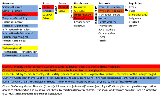The primary theme (in red), is the temporal availability barrier to physical access to chronic illness healthcare. The secondary theme (in brown) is access to episodic illness healthcare by specialist physicians. The tertiary theme (in yellow) is the technological IT catalyst/driver of virtual access to preventive/wellness healthcare for the underprivileged. The quaternary theme (in blue), is the spatial (distance/location)/temporal (scheduling)/financial (expenditure)/informational (educational)/human (psychological)/technological (medical) inhibitor to healthcare by general physicians/nurses/health workers. The quinary theme (no color), is financial (income)/informational (stimulant)/human (sociological/cultural)/technological (transportation) access to rehabilitative and palliative healthcare by traditional healers/pharmacists/social workers/care providers/peers/family for urban/rural/indigenous/disabled/elderly population.