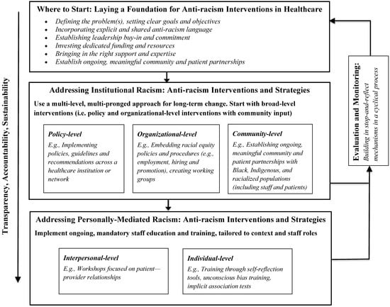 Hassen, N.; Lofters, A.; Michael, S.; Mall, A.; Pinto, A.D.; Rackal, J. Implementing Anti-Racism Interventions in Healthcare Settings: A Scoping Review. Int. J. Environ. Res. Public Health 2021, 18, 2993. https://doi.org/10.3390/ijerph18062993