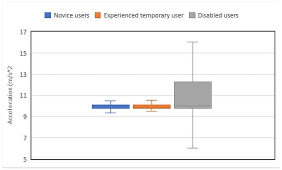For the purpose of analysis, the participants are grouped in three categories: novice users, experienced temporary user, and disabled users. Table 2 presents the analysis of motion measurements for each group calculated from raw data. The left ankle acceleration of each user of the three groups was measured using the video analysis, with the left side chosen because it was weight bearing for the majority of users.
