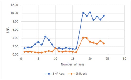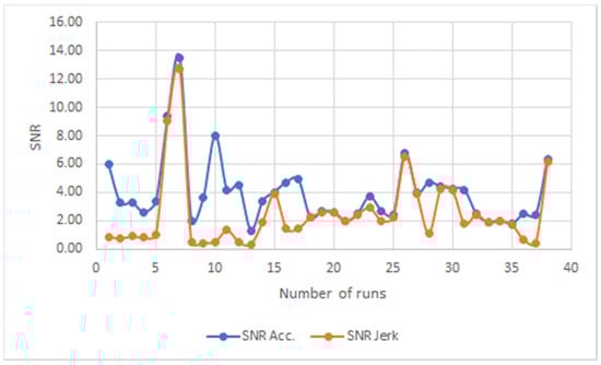 As the signals of such parameters tend to carry a lot of noise, differ even in people of the same age group and health status, and are affected by the measurement methods, additional processing is required to extract meaningful information from them. There are many studies in medical imaging systems that use Signal-to-Noise Ratio (SNR) for measuring the picture quality of images [] in order to achieve improvements in penetration depth in medical ultrasound []. Increased SNR can also be used to allow imaging at higher frequencies and thereby increase spatial resolution without any loss of penetration []. SNR has been used extensively in signal processing [,,], where there is noise interfering in the signal, and large values of SNR are considered good outcomes since it represents a strong signal with low noise. In other words, we calculate SNR as a measure of useful information to false information, as the acceleration of the participants in the present study incorporates noise. The use of SNR in our context is different and it has been calculated as the inverse of the coefficient of variation, and this is the first time that SNR has been used to assess the smoothness of movement. Because of this, the SNR that we calculate is dimensionless.
