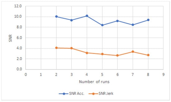 Additionally, the data is processed to calculate Signal-to-Noise-Ratio (SNR) of acceleration and jerk. In practice, SNR is equivalent to the inverse of the coefficient of variation [], or it is approximated by the ratio of the mean of all data () divided by the standard deviation of all data (s) as shown in Equation (2), as variables are always non-negativeE [ X 2 ] = σ 2 + μ 2 {\displaystyle \operatorname {E} \left[X^{2}\right] = \sigma ^{2}+\mu ^{2}}.