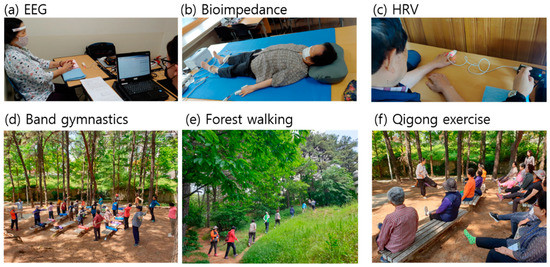 Measurement of (a) EEG, (b) bioimpedance, and (c) HRV, and pictures of forest therapy sessions involving (d) band gymnastics, (e) forest walking, and (f) Qigong exercise.