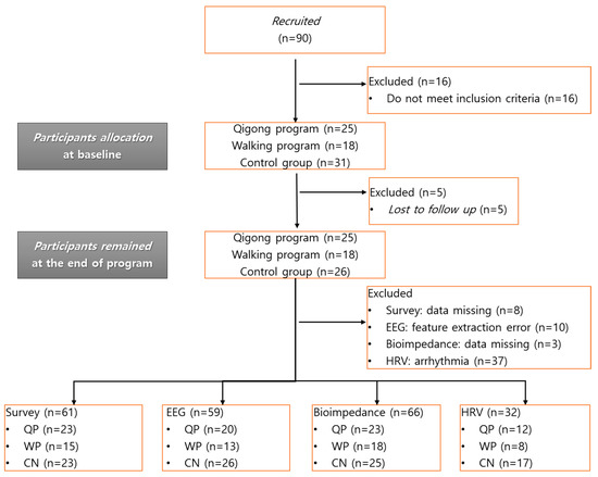 A total of 90 subjects were recruited for the study from three recruitment sites. Of them, 16 were screened out due to the exclusion criteria, so 25 subjects remained in the QP group, 18 subjects in the WP group, and 26 in the CN group at the end of the study; no subject dropped out during the FTP sessions, while five subjects in the CN could not complete the post-test measurements due to private reasons. The dataset was screened prior to the analyses, and samples were excluded if they were missing demographic information, lost in the follow up period, featured extraction errors, or were missing data or pathophysiological features such as arrhythmia (Figure 2). As a result, 61 subjects remained in the questionnaire analysis, 59 in the EEG analysis, 66 in the bioimpedance analysis, and only 32 in the HRV analysis. As arrhythmia was a common health problem in our old-age participants, 37 subjects were excluded from the HRV analysis.