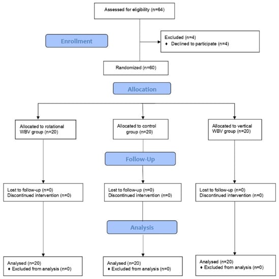 Participants were randomly allocated into one of three groups: a group (n = 20) that experimented with vertical WBV, a group (n = 20) that experimented with rotational WBV, and a control group (n = 20) that did not perform any training. The three groups were matched for age, weight, height, body mass index, and pain duration (Figure 1).
