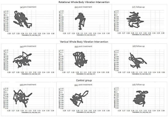 Figure 2 displays the mean of the mediolateral body sway (axis X) and mean of the anteroposterior body sway (axis Y) in pretreatment, post-treatment, and follow-up for both intervention groups (rotational and vertical WBV) and for the control group.