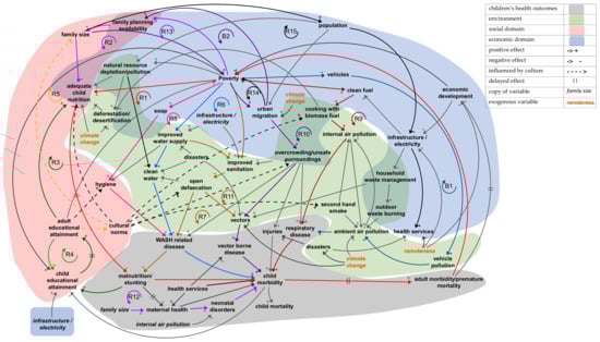 In the Results section, the CEH system is represented by a CLD that contains four interlinked sections; children’s health outcomes and the variables that influence them grouped into environmental, social, and economic domains. These domains align with the three pillars of sustainable development on which the UN Sustainable Development Goals (SDGs) are based; environmental, social, and economic [29,30].