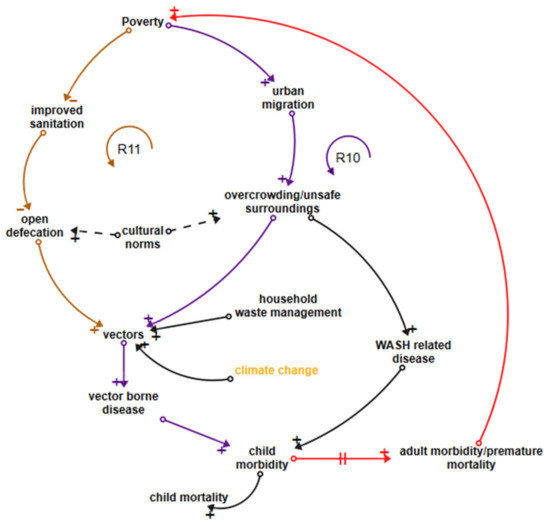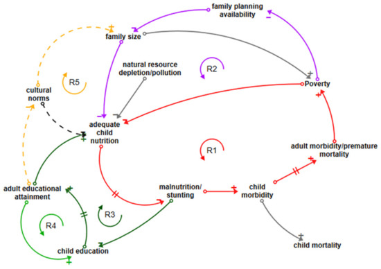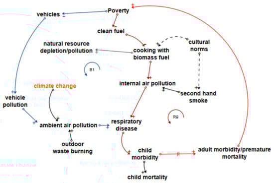 Many studies have reported on children’s health and the environment, but it appears that none have used a CLD (also known as an influence diagram) [28] to represent the big picture, the underlying feedback mechanisms and potential key leverage points. The objectives of this paper are firstly to represent the major feedback loops that link children’s health with the environmental, social, and economic domains in LDCs and secondly to seek insights into potential leverage points and interventions.