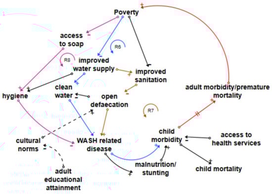 - opposing—denoted by a −, when an increase in a variable causes a decrease in the variable it influences and vice versa, e.g., a clean water supply decreases WASH-related disease [28].