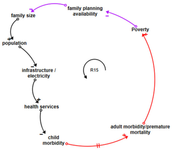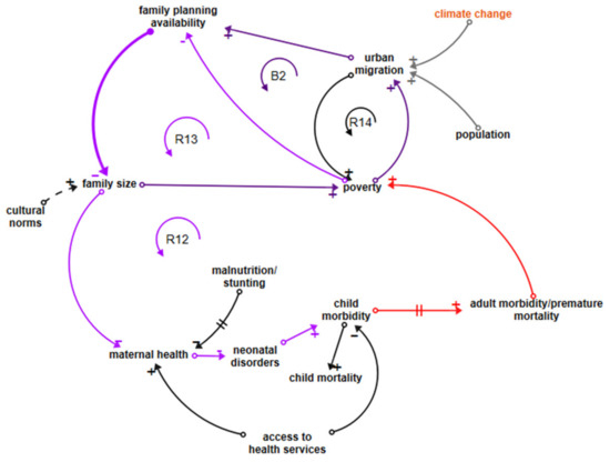 | Family size—cultural norms and expectations, reinforced by the requirement for children to support their parents, keep birth rates high, particularly in rural areas where the cost of raising a child is low and access to modern family planning services is limited or non-existent. | Family planning availability Cultural norms | − + | Population Adequate child nutrition | + − | [78,79] |