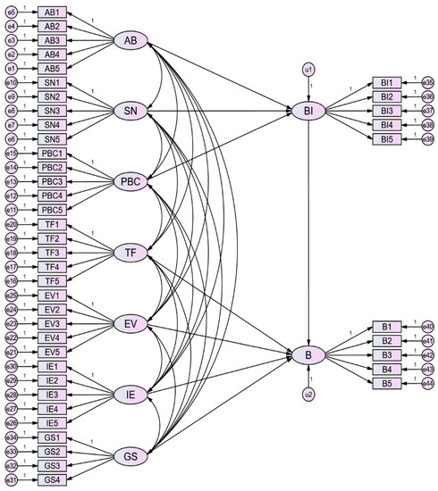 Table 2. The questions used for constituting the measurement scales were initially designed according to the basic guidelines of TPB (i.e., AB, SN, PBC, and B) and the items identified from existing literature (including TF, EV, IE, and GS). A five-point Likert scale was employed, ranging from “1” (strongly disagree) to “5” (strongly agree). In the third section, an open question, namely, “please provide any comments on this questionnaire”, was proposed to invite the respondents to provide their opinions. Then, three interviews with two experienced professionals and one scholar whose research interest is in this field were conducted to improve the questionnaire.