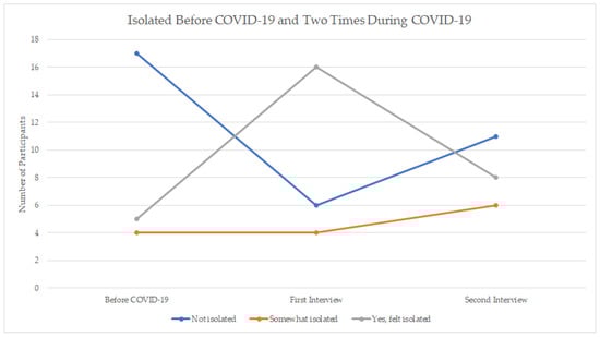 Figure 1 shows the reported levels of isolation before COVID (retrospective), during the first interview, and during the second interview. Of the 17 people who reported NOT feeling isolated prior to COVID-19, all but four people reported being isolated during COVID-19 restrictions (May–June). Five of these 17 people had returned to feeling NOT isolated one month later; however, for the bulk of people (n = 12) the feeling of isolation persisted.