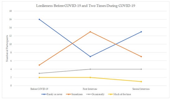 After obtaining oral consent, the principal investigator and two research assistants conducted 26 telephone interviews from May to June 2020. The interview began with a series of sociodemographic questions (e.g., when/where were you born; are you retired, what did you retire from; what is your highest level of education, and do you live alone?) and proceeded with more questions about their social networks, community, and activities during COVID-19 (e.g., Do you have any children or relatives living in your area? How many? How far away? How often do you normally see them? How many friends do you have in your community? How do you keep in touch with friends and family during this pandemic? What sorts of activities are you doing during this pandemic?). Participants were also asked to rate how often they felt lonely during a given week both prior to COVID-19 pandemic as well as currently (i.e., during COVID-19 pandemic) using a 4-point scale ranging from 1 (never, rarely, less than 1 day), 2 (sometimes, 1–2 days), 3 (occasionally, 3–4 days), and 4 (all the time, 5–7 days), a commonly used loneliness item taken from the CES-D scale []. Asking people to rate their loneliness in this way allowed us to examine whether people reported perceived changes (increases, decreases, no change) in their levels of loneliness pre-and during-COVID-19. At the end of the interview, participants were asked another series of open-ended questions about challenges, needs, and resources and strategies within their environments. All interviews were digitally recorded and ranged in length from one hour to an hour and 45 min.