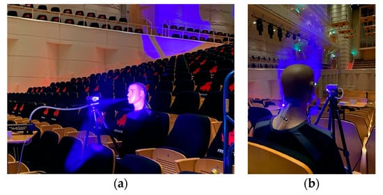 Humans emit respiratory droplets ranging from 0.1 to several tens of micrometers in diameter depending on respiratory activities such as breathing, speaking, or sneezing [10,11,12,13]. Heavier particles are strongly influenced by gravity, and fall down within a few meters, thereby contributing to virus transmission between individuals over relatively short distances. At this point, it needs to be emphasized that physical parameters such as relative humidity, the ambient air temperature, and the intensity of fluid turbulence influence the range and time particles are suspended in air [14,15,16,17,18,19,20,21,22]. Lighter particles (aerosols) in turn can stay in the air for quite a long time and could transfer the virus over larger distances [23,24]. Furthermore, they are reported to reduce in size by evaporation, depending on the content of salts and organic material within the liquid phase. Thus, the ultimate limit in size is the diameter of the virus itself (approx. 0.14 µm for SARS-CoV-2) [13,25,26,27]. Face masks serve to reduce the number of particles, especially heavier ones [17,28,29]. Considering this, more attention should be paid to small particle sizes (diameter < 1 µm) when indoor viral aerosol dispersion is discussed. In addition, CO2 measurement is considered as a biomarker for monitoring infectious aerosol occurrence [30,31,32,33]: the lower the indoor CO2 concentration, the lower the (potential infectious) aerosol concentration. Therefore, experimental investigation of spatially resolved aerosol and CO2 distribution in large indoor environments such as concert halls and theaters with respect to ventilation is highlighted in this paper. Accurate knowledge on dispersion of viral aerosols by airborne routes will be of great value for developing risk assessment when considering re-opening concert halls and theaters after pandemic lock down.