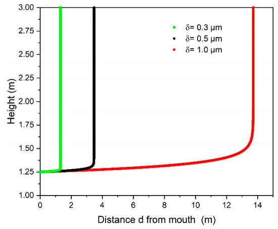 The differential equations are solved numerically using the software tool mathematica (Wolfram Research Inc., Champaign, IL, USA) for fixed aerosol sizes. The results for 3 different aerosol diameters are summarized in Figure 3. It shows that aerosols with a diameter of = 0.3 µm and initial horizontal exhalation velocity of will be discharged by the vertical ventilation air flow () after a travelling distance of about 1 m and lifted to a height of 3 m. In addition, the diffusion coefficient of CO2 molecules in air has been calculated for room temperature and atmospheric pressure as indicating that the movement of CO2 molecules in air can be neglected compared to the velocity of the vertical air flow of the ventilation. This suggests that also the CO2 molecules will be captured by the ventilation air flow and directed towards the ceiling.