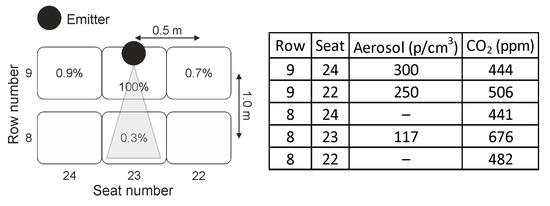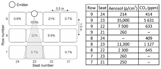 In Figure 4, an example for locations and results for the CO2 and aerosol measurements in the concert hall is shown when the dummy is not wearing a face mask (refer to Figure 1a). The dummy is located in row 9 at seat number 23, constantly emitting 35,000 p/cm3. At a distance of 0.5 m the number density of particles is diluted down to 11,300 p/cm3 (row 8/seat 23) and at a distance of 1.5 m it is measured to be 260 p/cm3 (row 7/seat 23) which is 0.7 % of the particle number density emitted from the dummy. The seat located directly on the right of the dummy (row 9/seat 24) shows an aerosol concentration of 214 p/cm3 while at the seat to the left (row 9/seat 22) a concentration of 7500 p/cm3 was obtained and at row 8 seat 22 the concentration was 2300 p/cm3, respectively. This is due to the effect that on these positions besides the constant vertical air flow also an unsteady and temporarily fluctuating horizontal air flow with was measured, indicating that even a slight change in air flow can result in a significant temporarily dependent change of aerosol dispersion in the neighborhood of an emitter.