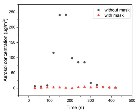 As already discussed above, even slight local horizontal air flow fluctuations may influence the spatial dispersion of aerosol and CO2 emitted by the dummy. Therefore, also time-resolved measurements are performed. This is done for the dummy wearing a surgical mask and with unblocked exhalation flow. Typical results of such an experiment are shown in Figure 6. A temporarily varying air stream of was measured, the distance between the exhaling dummy and the aerosol and CO2 detector was about d = 0.5 m. As can be seen in Figure 6, there is a strong temporal fluctuation of the aerosol concentration obtained—changing between 5 µg/m3 which is about the background concentration and up to 240 µg/m3—when the dummy is not wearing a mask. However, when the dummy is wearing a face mask then the aerosol concentration is all the time around the background concentration < 5 µg/m3. For comparison, a concentration of 25 µg/m3 converts to about 500 p/cm3 for the DEHS aerosol used here.