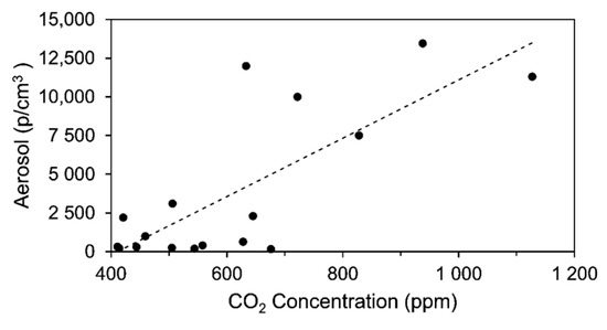 The simultaneous measurement of aerosol and CO2 concentration in the present investigation enables us working out a correlation between CO2 and aerosol concentrations under real conditions as they are obtained in the concert hall. The result is shown in Figure 7, indicating a Pearson’s correlation coefficient of r = 0.77 for the given conditions. Under laboratory conditions coefficients up to r = 0.98 have been derived.