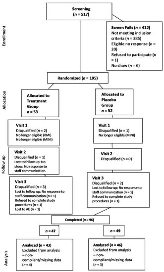 Recruitment and study completion are depicted in Figure 1. After screening 517 individuals, 105 subjects were randomized into the study. Of these, 96 subjects (91.4%) completed the study, although seven individuals (6.7%) were excluded due to data errors or adherence issues. This yielded a final sample of 89 participants (84.8%), with 43 receiving PBB and 46 receiving placebo. However, sleep data for one individual in the placebo group were unavailable due to a data error, so sleep outcomes were evaluated for N = 45 participants in the placebo group.