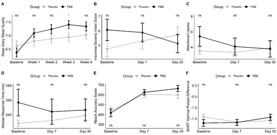 Mean (± SE) plots for outcomes with significant group by time effects, including sleep diary sleep quality (A), ISI score (B), lapses (C), PVT median reaction time (D), N-back accuracy (E), and BART optimal pumps difference (F). Tests of significance are between-group t-tests. * p < 0.05. ISI: Insomnia Severity Index, PBB: proprietary blend of botanical extracts, PVT: Psychomotor Vigilance Task, BART: Balloon Analogue Risk Task.
