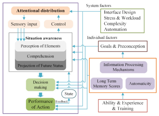 In essential, pilot’s unsafe behavior including social and individual cognition dimensions was rational and unconscious, whereas the initial hypothesis of TPB theoretical framework clarified that human behaviors was completely controlled by individual consciousness [12,29]. Nevertheless, researchers had confirmed that the adoption of the behaviors with high repeatability and experience cannot be completely explained by the rational TPB model [30]. Thus, aiming for better interpretation of rational behaviors, unconscious behaviors, and its correlation function, the situation awareness (SA) variable was introduced to identify the cognitive influencing pathway of individuals. SA was the specific representation of individual cognitive processes, including perception of elements (PB), situational understanding (SU) [31], and prediction of near future states (PS) [32,33], as shown in Figure 1. Hetherington et al. [34] had determined that the deficiency of SA is a directly critical causation of maritime accidents. Grech et al. [35] pointed out 71%, at least in part, of human errors could be attributed to SA-related problems. SA deficiency is a source of human errors that manifested itself as “loss of control over the situation” [36]. Since SA could perceive information through the display of devices and sensory organs, it is vulnerable to the influence of individual and social factors, such as experience, personal expectations, workload, and so on [37]. Therefore, the variables in the TPB framework (i.e., PBC, SN, and ATD) could realize the correlation of cognitive functions by influencing the information perception, understanding, and perception of SA (Figure 1).