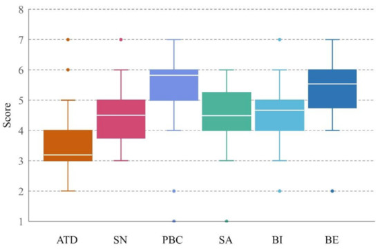 In order to enable the fitting of the questionnaire data into the hypothesis model, collected behavioral factors were quantified according to the social and individual cognitive path of the impact on the pilots’ unsafe behaviors. In this paper, a total of 306 questionnaire samples were sent to the pilot station of Shanghai Port, 295 samples were recovered with an effective rate of 96.4%, meeting the requirements of statistical analysis. To evaluate and synthesize the measurement variables, a workshop was conducted with subject-matter experts in cognitive analysis of unsafe behaviors. All the measurement items in the questionnaires were formatted to numerical analysis data, which was simplified and reserved by ATD, PBC, SN, SA, BI, and BE (Figure 6). The dispersion of data in different quartiles was basically within the normal range after excluding the abnormal data values, i.e., these dots in Figure 6. The Cronbach’s of each latent variable was thus greater than 0.7 between 0.776 and 0.885, and the combined reliability (CR) was greater than 0.88, indicating that the structural equation model had good reliability.