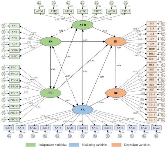 In order to ensure the explanatory ability of latent variables for pilots’ unsafe behaviors, significant correlation paths were identified by the confirmatory factor analysis (CFA). The average variance extracted (AVE) (greater than 0.5) and the square root of AVE (greater than the correlation coefficient of other different latent variables) were effective indexes that verify the convergence and discriminant validity of the model. Furthermore, it was found that the adjusted endogenous latent variables had a better performance as shown in Table 4. In addition, combined with the standardized path coefficient and its significance analysis, effective correlation modes were obtained as shown in Table 5. As for the measurement model, the correlation coefficient of cognitive paths reached a significant level, and the correlation coefficient of SA and PBC was the largest, indicating that the individual cognitive processes and self-control ability of unsafe behaviors influenced each other. However, SN had no significant correlation with SA and ATD, respectively. This result in line with the reality, that is, the experiential properties of individual cognition on behaviors during ship pilotage made pilots less susceptible to the influence of social norms.