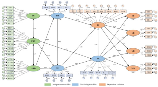 Cognitive mechanism recognition was used to integrate social cognitive and individual cognitive factors to reveal the cognitive processes of rational and unconscious unsafe behaviors. The mediating role of SA in the path dependency analysis had been effectively verified. Therefore, according to the hierarchical classification of behavior categories and the three-level model, the structural model was optimized to clarify the influence of the structural contents of SA on specific unsafe behaviors. The structural model of observed variables with goodness-of-fit (Table 8) was determined in the structural equation numerical model by combining the questionnaire data (Figure 8). This result showed that SN and ATD significantly had an effect on PB (0.352, 0.441), while ATD also making a difference to SU (0.237). Additionally, PBC not only had a significant impact on SU (0.615), but also played a significant role in PS (0.453). Furthermore, both unconscious and rational unsafe behaviors could be effectively explained by SA, and the direct effects on VB (0.691) and MB (0.593) were more significant.
