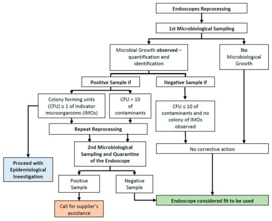 The results of the microbiological sampling are sent monthly to the Infection Diseases and Endoscopy departments. They will also be promptly informed in the case of detection of positive samples, specifying which endoscope is contaminated. In the latter case, it is necessary to repeat the reprocessing of the instrument, resample it, and put it in quarantine for 3 days, waiting for the evaluation of the microbiological samples (Figure 1).