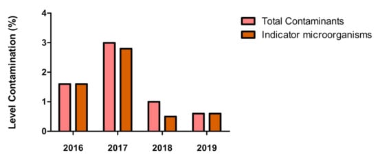 Number of total samplings by instrument and number of indicator microorganisms (IMOs) and contaminants, with respective level of contamination in percent, from January 2016 to December 2019.
