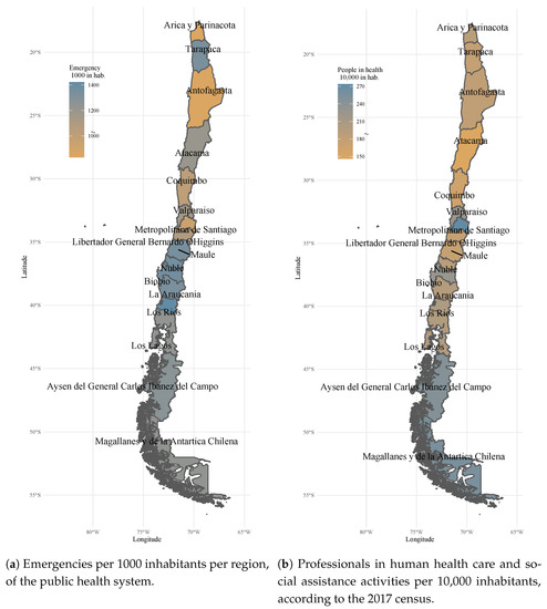 Figure 1a,b show a heat map where it is observed that there is a lack of health workers per 10,000 inhabitants, a critical situation that is one of the causes of the overuse of the emergency service.