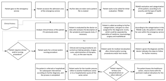 Subsequently, improvement proposals were prepared based on the 101 surveys that were carried out, the analysis of the processes is detailed in Section 4, the investigations in Emergency Services in fast tracking, and the use of ICT in telemedicine [30,31] for remote access and sharing of patient records and medical records [32].