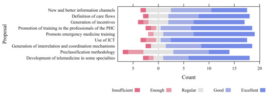 In Figure 3, the results of the evaluation of Table 4 are shown. In the graph, it can be seen in the evaluation that the best evaluated proposal is “use of ICT” since it obtains 71.4%, followed by “Promotion of training in the professionals of the PHC”, “Promotion of emergency medicine training” and “Development of telemedicine in some specialties” with 57.1%. It is observed that “Pre-classification methodology” was the most heterogeneous measure in which 14.3% of the experts rate it as insufficient.