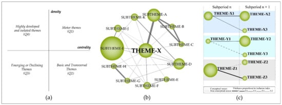 The previously identified themes were then plotted on a bi-dimensional diagram composed of four quadrants, in which the “vertical axis” characterizes the density (D) and the “horizontal axis” characterizes the centrality (C) of the theme [28,29] (Figure 1a) [18,20,25,30,31,32,33].