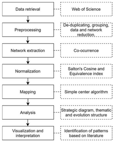 Subsequently, a network reduction was applied in order to exclude irrelevant words and co-occurrences. For the network extraction we wanted to identify co-occurrence among words. For the mapping process, we used a simple center algorithm. Finally, a core mapper was used, and the h-index and sum citations were selected. Figure 2 shows a good representation of the steps of the BPNA.